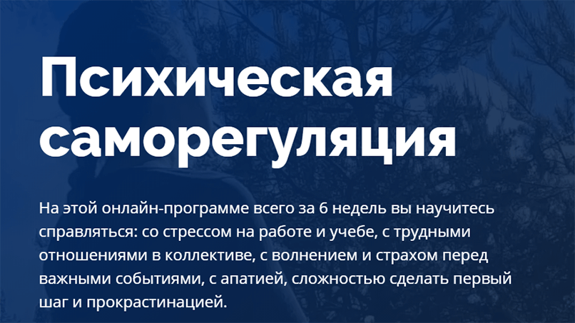 Описание. Курс психической саморегуляции помогает избавляться от любых негативных переживаний, настраиваться на позитив. Осваивать его вы будете в течение шести недель, за это время пройдете 25 уроков. Каждый урок длится 25-30 минут, проходить занятия быстрее, чем заявлено в расписании, нельзя. Это сделано намеренно — чтобы ваш мозг переваривал всю полученную информацию за время перерывов.