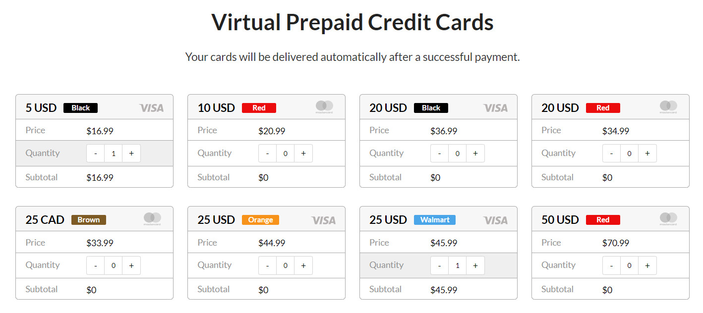 Высокая цена обусловлена потенциальными преимуществами. Виртуальные карты Visa и MasterCard выпускаются в автоматическом режиме, номиналы от 5 до 1000$, документы для подтверждения личности от вас не потребуют. Карты разделены по цветам и критических особенностей не имеют за исключением оранжевой: её невозможно будет использовать нигде, кроме как для оплаты товаров в магазинах США.