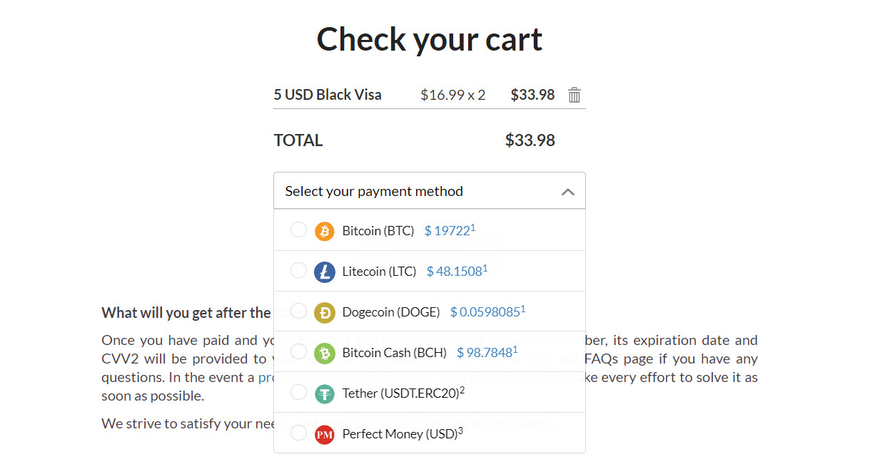 EzzoCard – один из самых простых, и в то же время дорогих сервисов для получения предоплаченных карт с определённой суммой на счету. Никаких регистраций: выбрал, добавил в корзину и оплатил. Все они выпускаются банками Соединенных Штатов и Канады. Приобретаются виртуалки оплатой со счета криптокошелька (предлагаются варианты) или через Perfect Money.