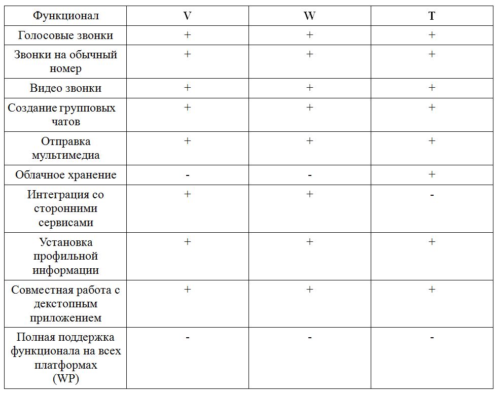 Данная таблица не предоставляет информацию обо всех аспектах функциональной составляющей мессенджеров, но позволяет наглядно продемонстрировать равенство всех 3 испытуемых.