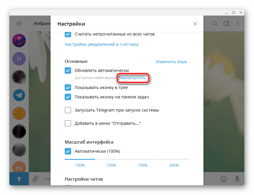 Если в данной опции пункт «Обновлять автоматически» активен (ползунок сдвинут вправо), то Телеграм будет уведомлять вас о наличии новой версии — в нижнем левом углу экрана в боковом меню будет возникать уведомление «Обновить».