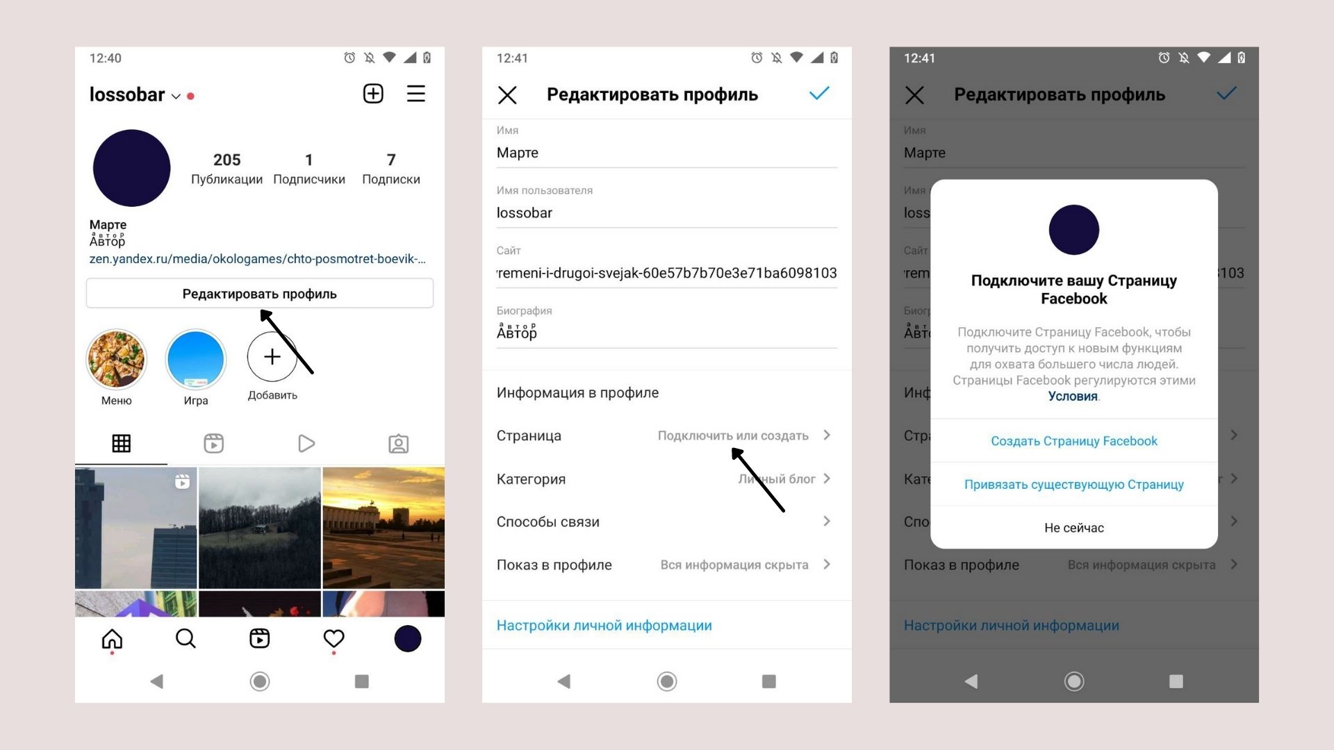 Шаг 4. Привязываем к профилю страницу в Facebook. Делается это в том же окне редактирования профиля: в разделе «Информация о профиле» выберите пункт «Страница» — можно привязать уже существующую страницу или создать новую.