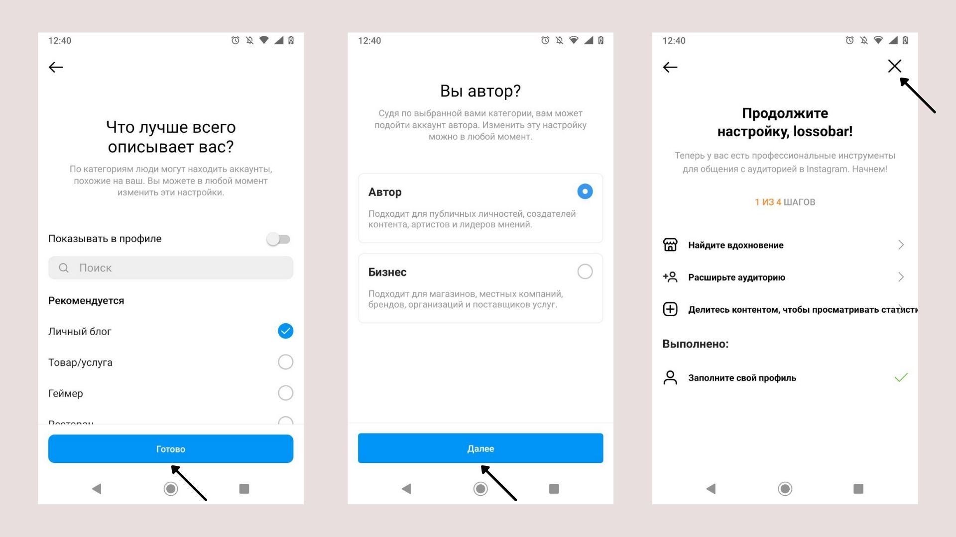 Шаг 3. Выбираем тип аккаунта и вид профиля из списка. Выполняем предложенные Instagram шаги для настройки или пропускаем. Все данные можно будет изменить позже.
