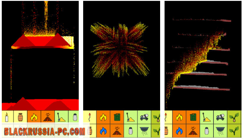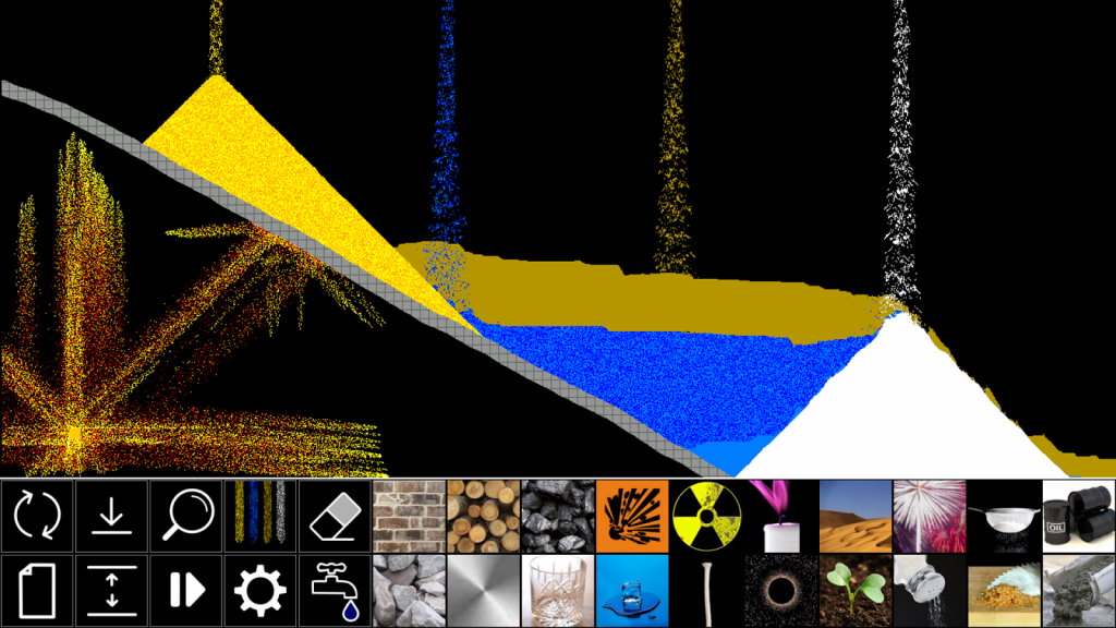 На самом деле, пользователю доступен очень широкий выбор сыпучих материалов. Каждый из них отличается по своим свойствам, но самое главное, но цвету. Есть как вполне привычные песок и опилки, так и более интересные и необычные материалы. Например, Песочница предложит вам поиграть со ртутью, нефтью, радиацией и даже космической пылью. Так что разнообразия в этой игре действительно более чем достаточно. Как только вещество окажется на игровой области, оно может остаться лежать на месте, а может начать ходить волнами, заиграть разными красками и смешаться с другими материалами. Звучит очень весело, но еще приятнее наблюдать за этим процессом и принимать в нем участие.