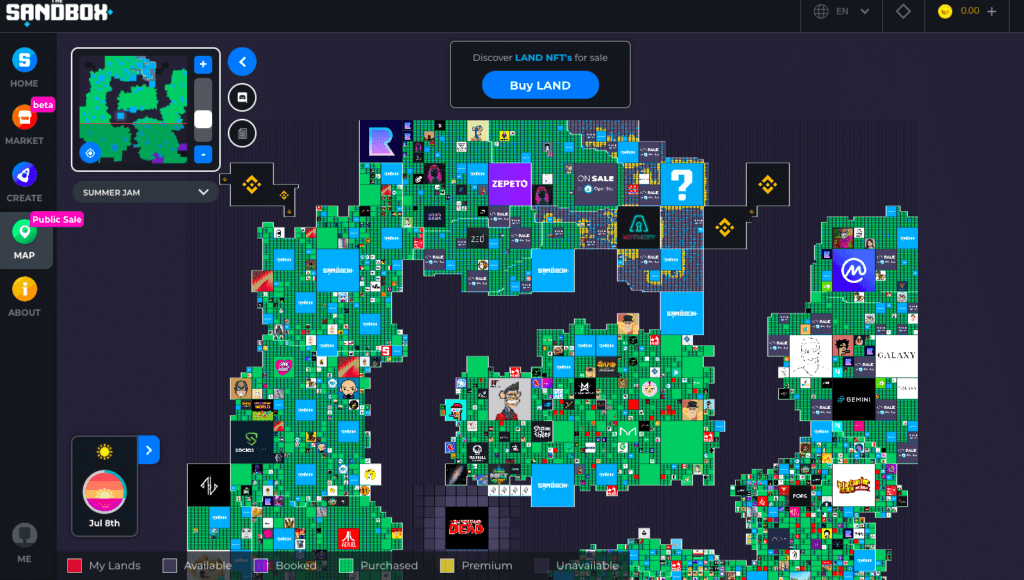 Около половины земли в игре уже выкуплено компаниями и партнерами The Sandbox. Эти участки принадлежат Atari, Rollercoaster Tycoon, Binance, Smurfs, Square Enix, Deadmau5 и многим другим. При этом чем ближе желаемый LAND к их земле, тем дороже его цена.