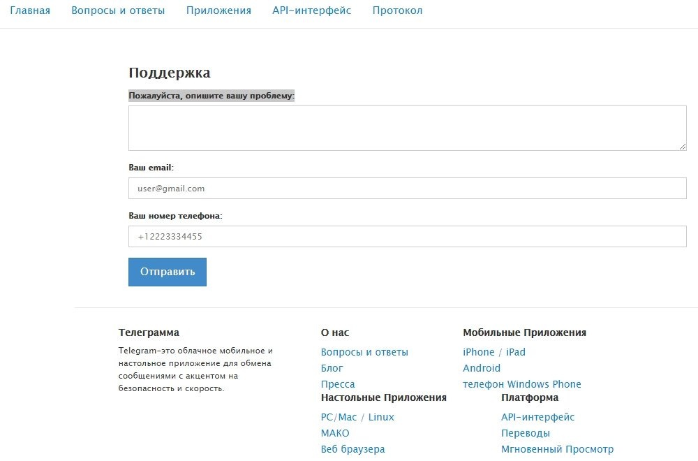 Первый используется для решения серьезных сбоев, сложных технических неполадок. Чтобы служба поддержки рассмотрела и ответила на обращение, заполняется форма запроса на специальном сайте. На него можно зайти и пожаловаться, если нет доступа ни к мобильной, ни к компьютерной версии Телеграм.