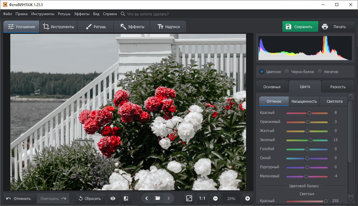 В основных параметрах улучшения можно повысить сочность красок, выполнить коррекцию температуры снимка. Во вкладке «Цвета» доступна гибкая настройка каждого отдельного оттенка. Например, вы можете притушить все тона, сделав выразительными только красные.
