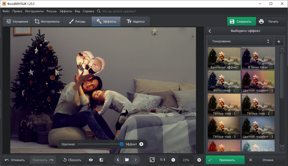 В разделе «Эффекты» вы можете подобрать интересные тонирующие фильтры для создания нужной атмосферы. Например, подкрасить новогодний снимок в морозные голубоватые тона.