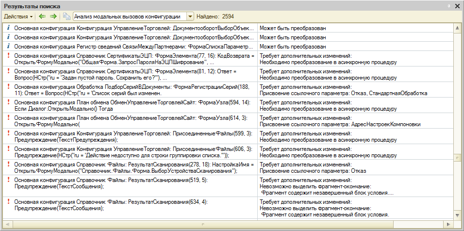 Можно не только найти все модальные вызовы, но и оценить возможность их автоматического преобразования (начиная с версии 8.3.5). Оговоримся, что автоматическое преобразование выполняется не во всех случаях, подробнее об этом можно прочитать в разделе .