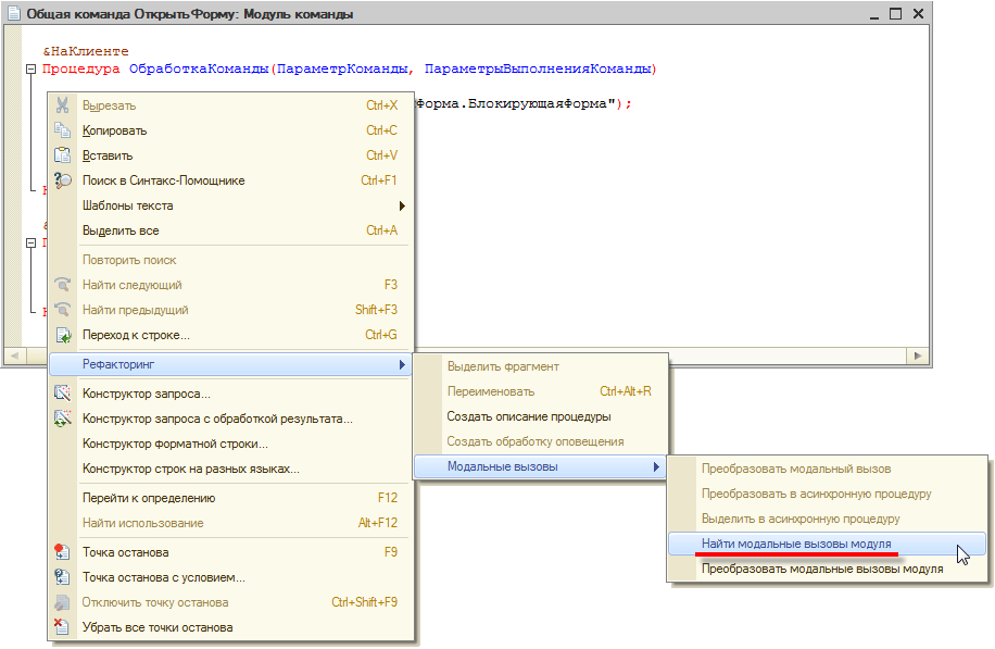 Можно найти все модальные вызовы в каком-либо одном модуле (начиная с версии 8.3.5). Для этого нужно открыть этот модуль и выполнить команду контекстного меню «Рефакторинг — Модальные вызовы — Найти модальные вызовы модуля» (эти же команды доступны из меню «Текст»):