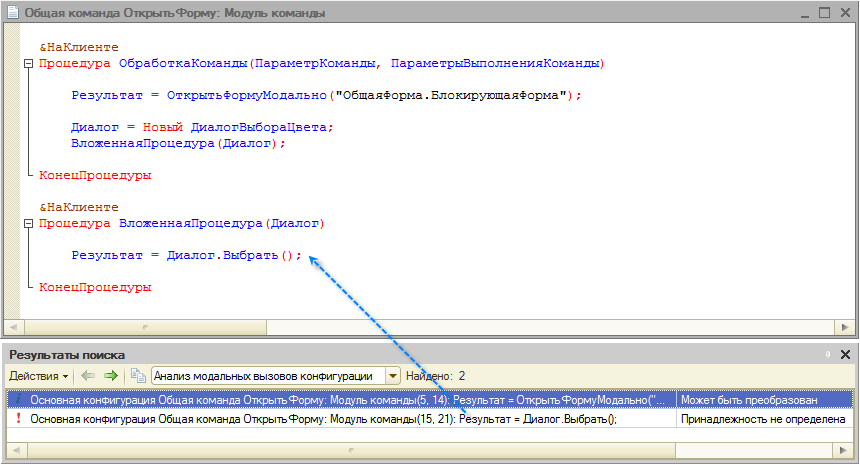 Нужно отметить, что эта проверка обнаруживает не все возможные модальные вызовы, а только те, которые можно определить «наверняка». То есть это модальные методы глобального контекста и модальные методы тех объектов, тип которых однозначно определён в анализируемом контексте.