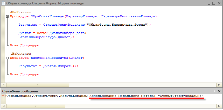 Поэтому, например, в приведённом примере проверка не обнаруживает модальное открытие диалога выбора цвета во вложенной процедуре. В контексте этой процедуры тип переменной «Диалог» неизвестен.