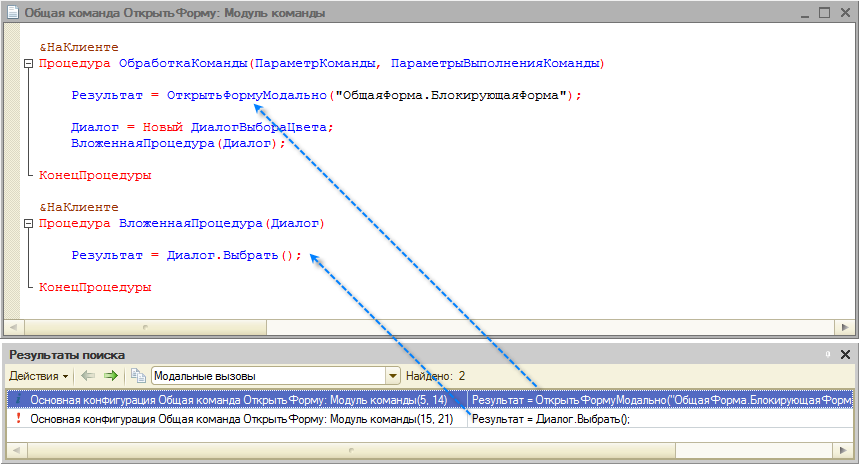 В этом случае будут найдены все строки кода, которые приводят или могут привести к открытию модальных окон. В том числе и те строки, где открытие модального окна возможно, если объект имеет определённый тип: