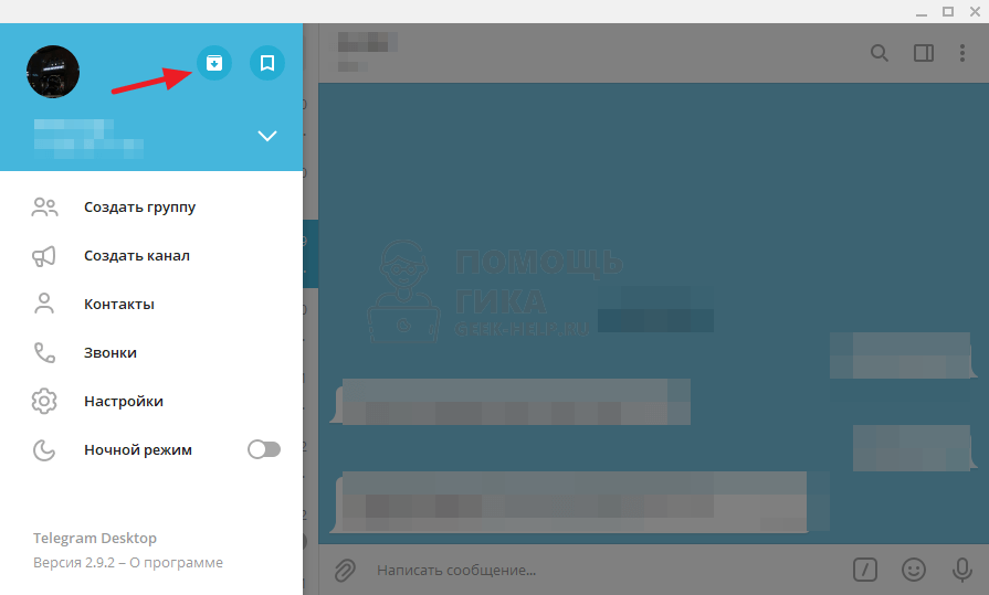 Архив с чатами в версии Телеграм для компьютера закреплен в верхней части, над всеми диалогами. Можно на него нажать, чтобы перейти к списку чатов, которые помещены в архив.