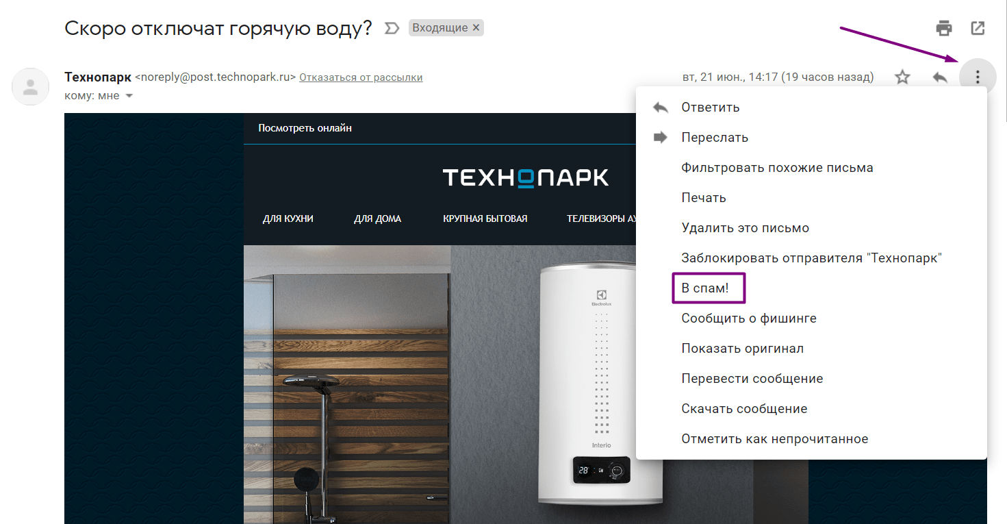 В большинстве современных почтовых сервисов работает автоматический запрет спама. Там стоят спам-фильтры, которые сами определяют нежелательные письма и отправляют их в специальную папку. Работают они хорошо, даже перестраховываются, из-за чего в спам могут попадать полезные рассылки, на которые пользователь подписался сам. Если же какое-то нежелательное письмо проскочит фильтр и попадет во «Входящие», избавиться от него, отправив в папку «Спам», в большинстве сервисов можно в пару кликов. Например, в Gmail, чтобы пожаловаться на навязчивую рекламу, нужно кликнуть на три точки в правом верхнем углу и выбрать пункт «В спам!».
