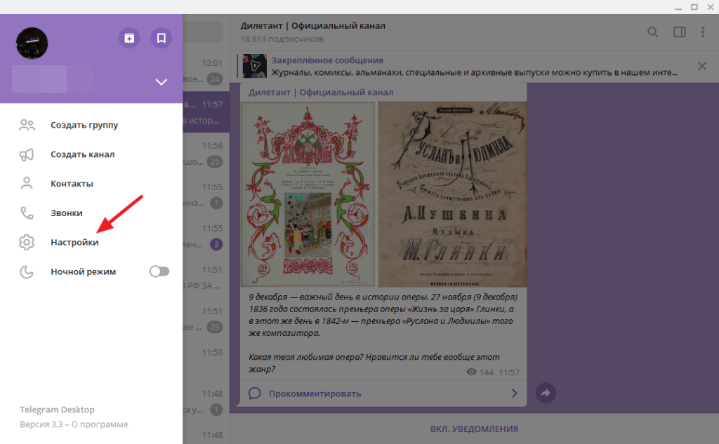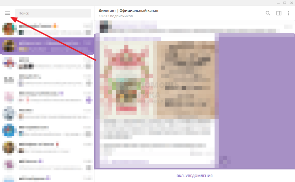 В официальном клиенте Телеграмм нажмите на три полоски в левом верхнем углу.