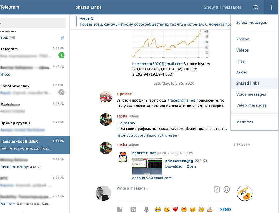 - Левая колонка отобразит все каналы и группы, на которые подписан юзер, а также активные чаты.
