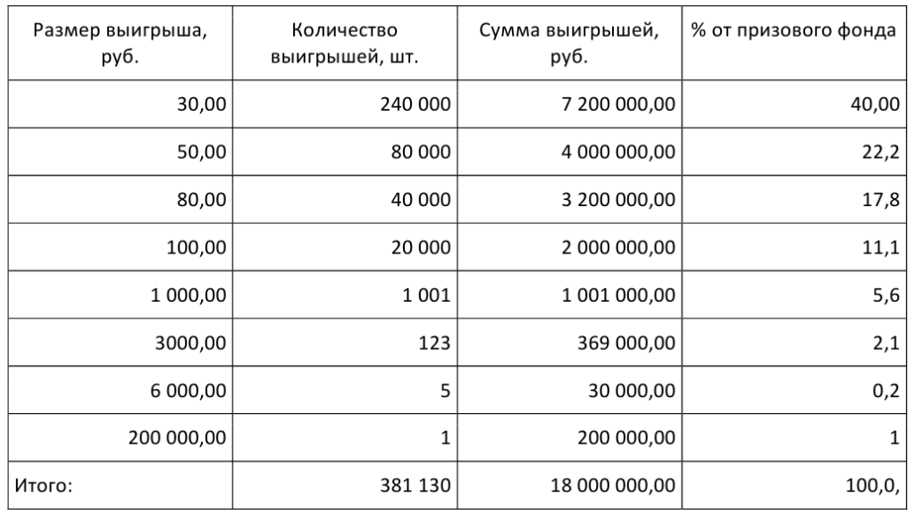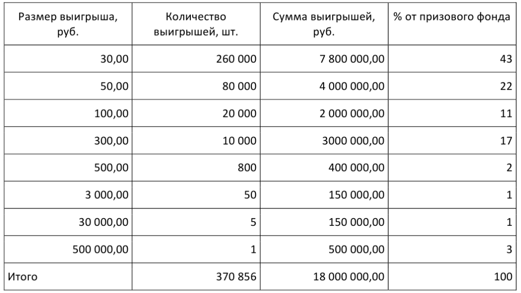 Как видим, тут максимальный выигрыш составляет 500 тысяч рублей, а шанс его выиграть – 1:1000000. При этом «выйти в ноль» получится с вероятностью в 26%, или 1:3,8. Всего же билетов с выигрышами чуть больше 37%.