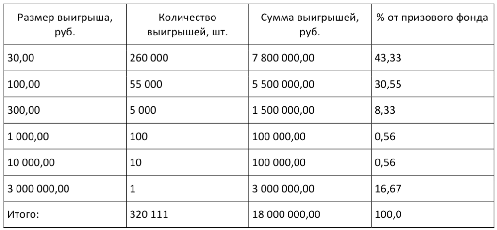 Здесь можно получить уже 3 миллиона рублей в качестве выигрыша (такой билет по-прежнему 1 на миллион), но других призов гораздо меньше. Всего выигрышных билетов тут меньше остальных вариантов – только 32%.