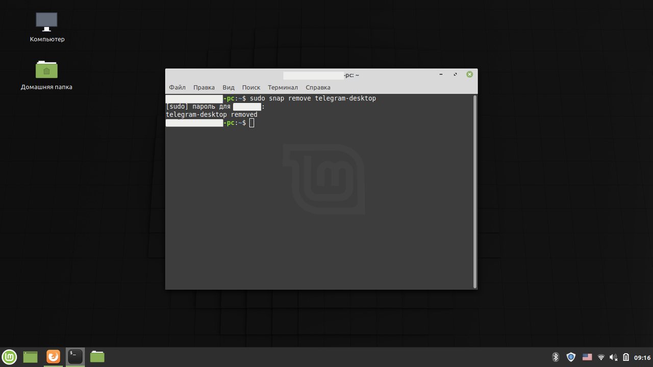 - Напишите в нем фразу: «Sudo snap remove telegram-desktop».