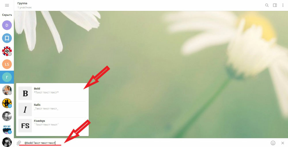 В поле ввода сообщения напишите @bold (вы могли заметить, что значок «собачки» ставится перед именами пользователями, названиями каналов и ботов). После этой комбинации введите текст.
