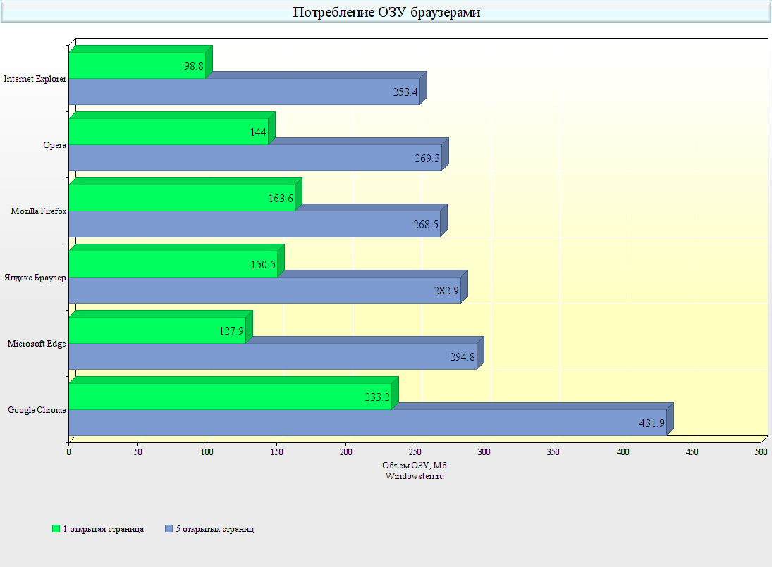 | Браузер | Потребление ОЗУ 1 страницей, Мб | Потребление ОЗУ 5 страницами, Мб |