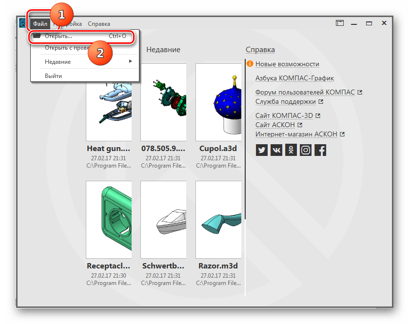 - Выполните запуск КОМПАС-3D. Щелкните «Файл» и далее нажимайте «Открыть» или воспользуйтесь Ctrl+O.