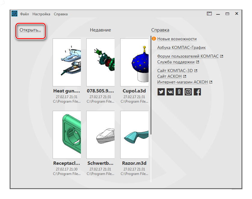 - Активируйте КОМПАС-3D Viewer. Для запуска окна открытия щелкайте «Открыть…» или используйте Ctrl+O.