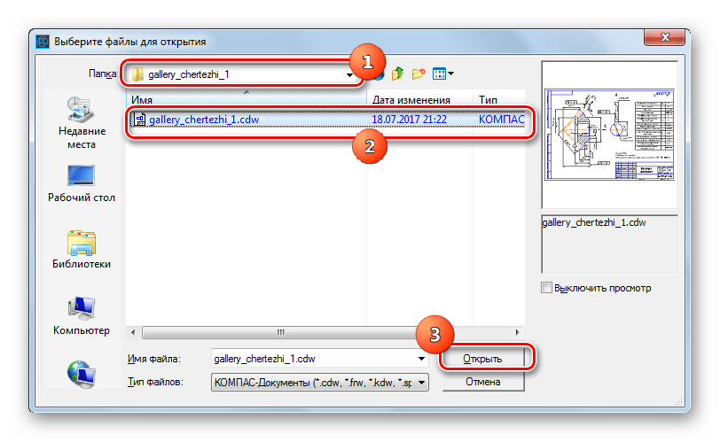 Затем, появится окно с папкой, в которой находятся соответствующие файлы. Кликаете левой кнопкой мыши (ЛКМ) по элементу с расширением CDW. Нажимаете на кнопку «Открыть».