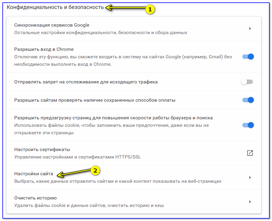 3) Далее нужно найти подраздел «Конфиденциальность и безопасность» и открыть вкладку «Настройки сайта» .