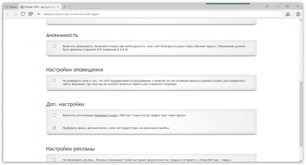 Со временем разработчики friGate убрали в своем продукте большую часть функций. Например, здесь больше нет инструментов для сохранения анонимности и сжатия входящего трафика. Но friGate по-прежнему отлично справляется со своей главной задачей – позволяет получать доступ к заблокированным сайтам.