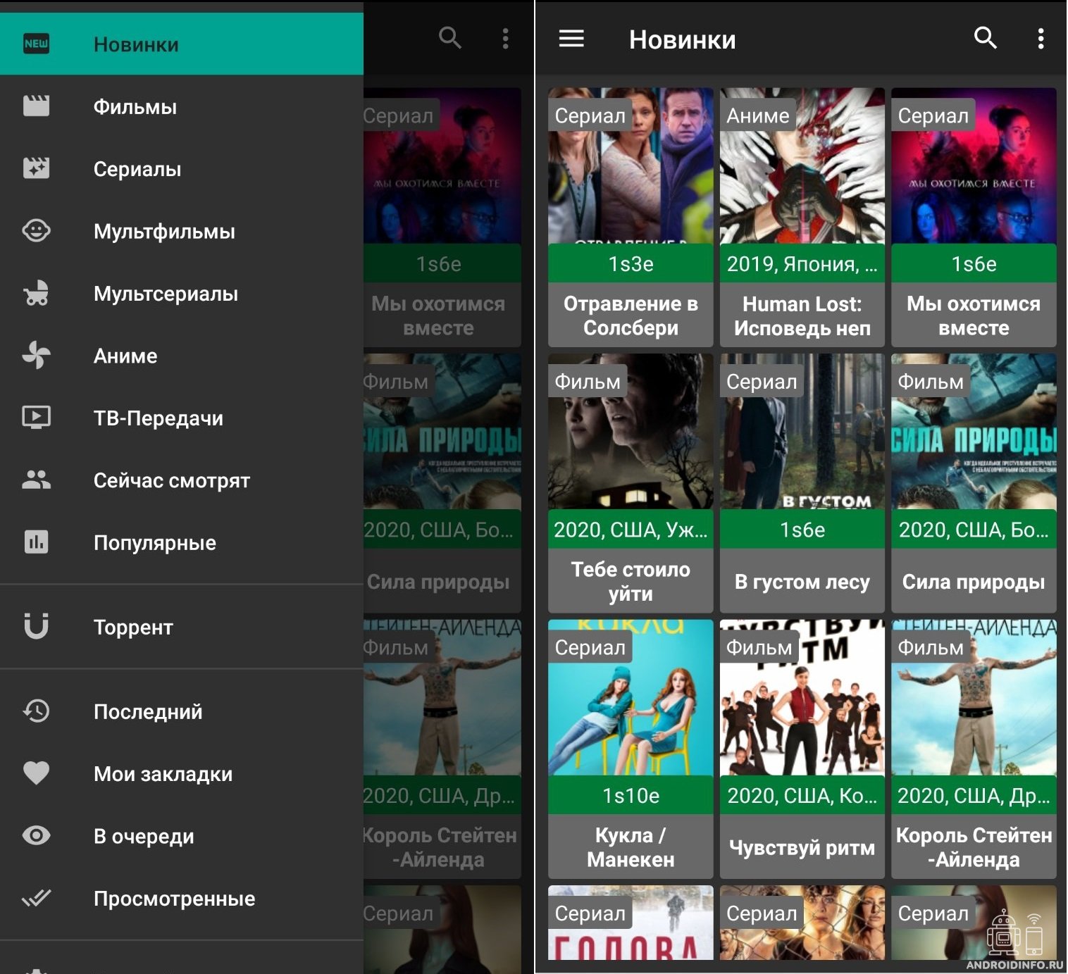 Приложение, способное искать фильмы на многочисленных ресурсах, поэтому пользователям не придется устанавливать дополнительные программы. Интерфейс Кино HD интуитивно-простой. После открытия приложения на дисплее появится окно со списком фильмов в разделе «Новинки» (при необходимости категорию фильмов можно сменить в настройках).
