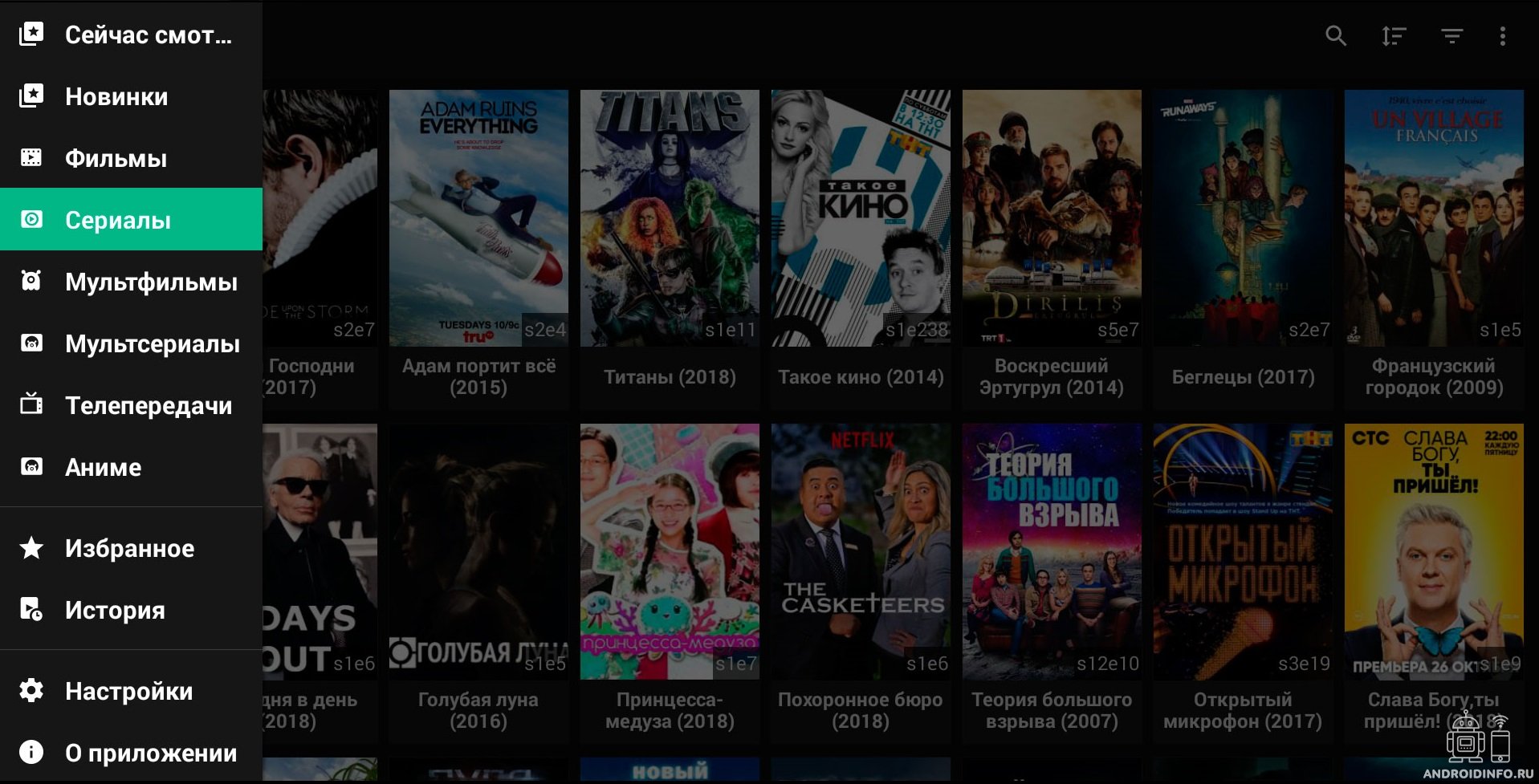 Нажав на кнопку каталога, вы сможете открывать подборки из фильмов, сериалов, мультфильмов, аниме и телепередач. Кроме того, понравившийся контент можно добавлять в раздел «Избранное». А все просмотренные фильмы долго хранятся в «Истории. Если у вас слабый интернет, можете установить в настройках низкое разрешение и смотреть фильмы без зависания. Также контент доступен в FullHD.