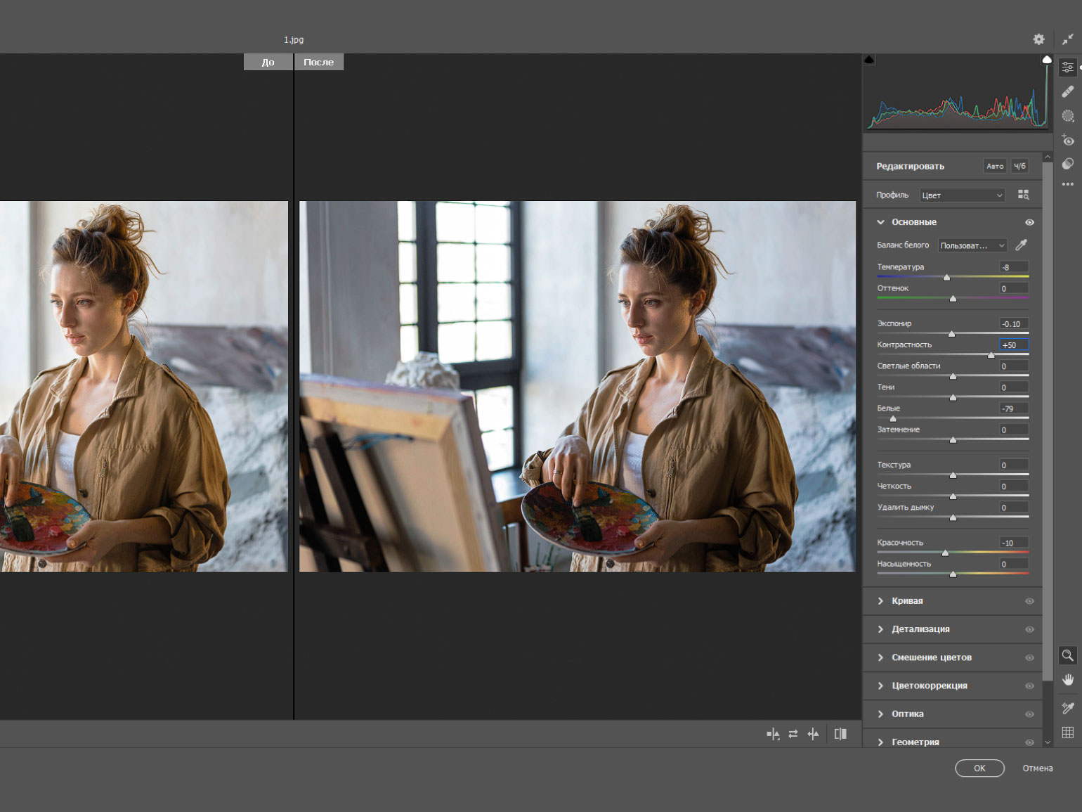 Если настройки легли неидеально на одно или несколько фото, можно подкорректировать их ползунками. Обычно хватает небольших изменений на вкладке Basic.