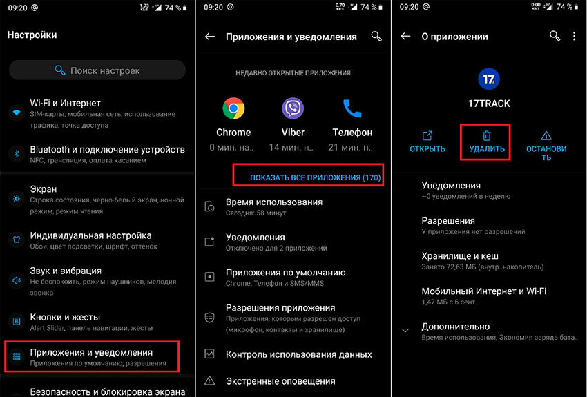 Выполнение последнего пункта подразумевает нажатие на название приложения в общем списке, переход в меню программы и выбор опции «Удалить». Если приложение находится в активном режиме, следует перед удалением нажать кнопку «Остановить».