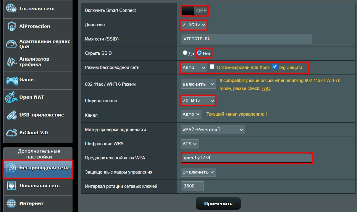 - Поменять настройки вай-фай роутера таким образом, чтобы конфигурация была такая же как на прошлом маршрутизаторе. Я говорю про имя Wi-Fi сети, пароль, ширину канала, поддерживаемые стандарты, а также частоту. Про это я напишу в следующей главе.