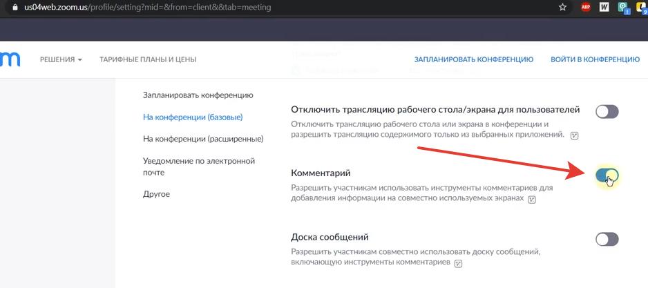Если автор трансляции не закрыл возможность комментирования вы можете рисовать на его доске по время демонстрации экрана. Для этого в верхней области найдите инструмент «Комментирование» и нажмите мышкой. Так же у проводящего трансляцию человека (администратора конференции) должны быть включены в настройках две опции: «Доска сообщений» и «Дистанционное управление». Как управлять их настройками, включить или отключить мы подробно описали в следующем разделе.