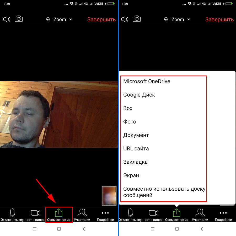 3. Нажмите на зеленую иконку «Совместное использование экрана», чтобы расшарить, фотографию, открытый в браузере сайт, документ на телефоне или в облаке.