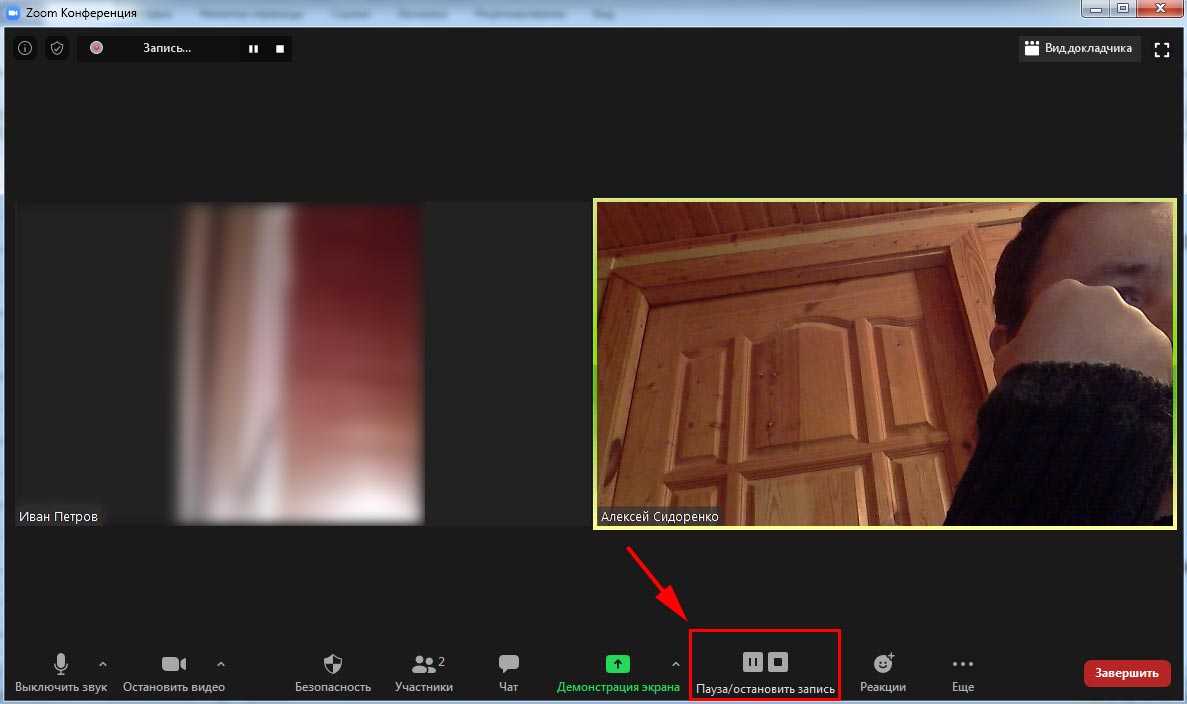 2. Приложение для видеоконференций начнет записывать онлайн-встречу. Жмите на иконку «Пауза», чтобы временно прервать запись, и на значок «Остановить запись» для полной остановки.