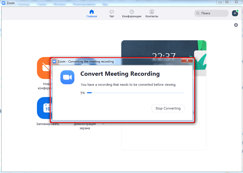 4. Когда организатор завершит мероприятие, начнется преобразование файла в формат .mp4.