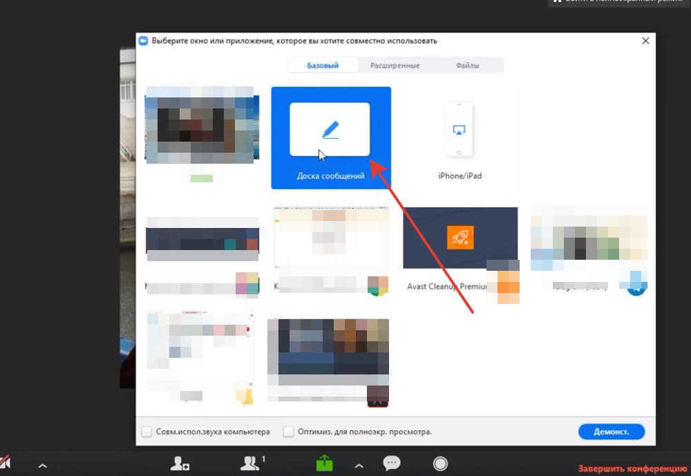 - Нажать на кнопку “Демонстрация экрана” (панель управления конференцией).