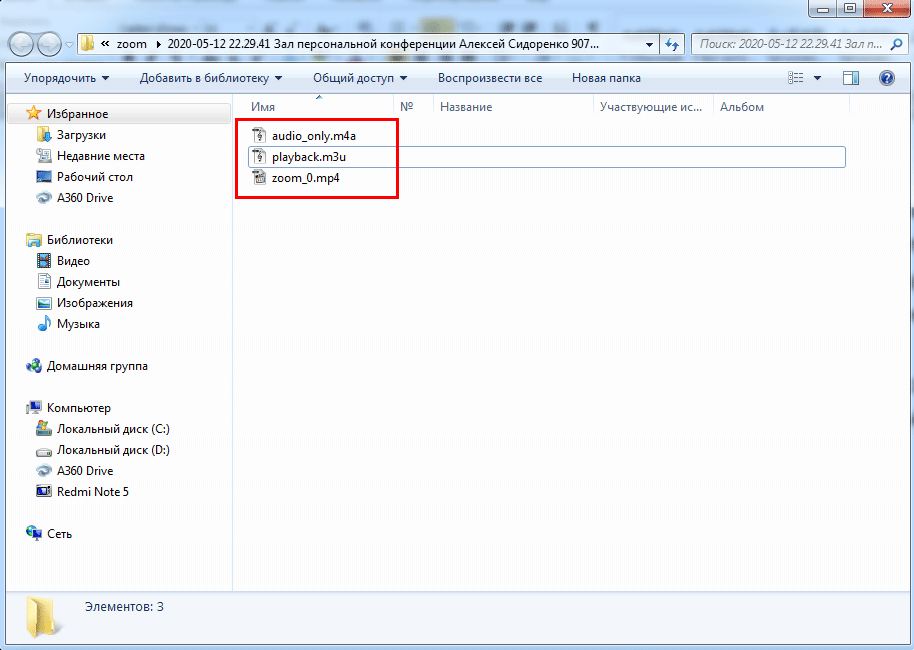 5. Программа создаст в папке «zoom» и откроет в окне проводника Windows дочерний каталог с сегодняшней датой и именем организатора в названии. Клиент конференций поместит в директорию видеофайл .mp4 и аудиофайлы в формате .m4a и .m3u.