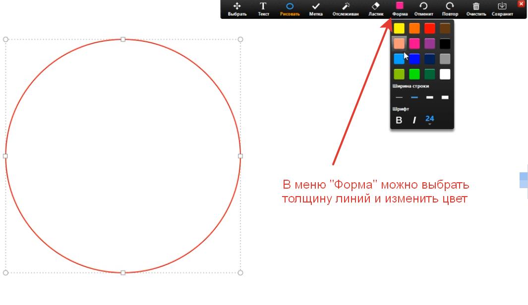 В панели управления есть так же другие инструменты для более детальных обозначений и визуального оформления вашей презентации или проведения онлайн урока. Давайте познакомимся с наиболее часто используемыми:
