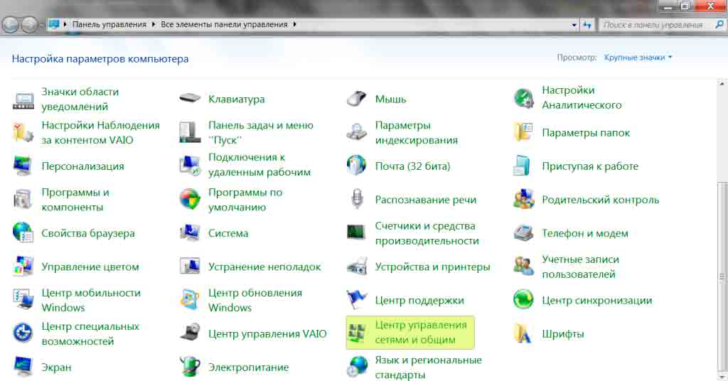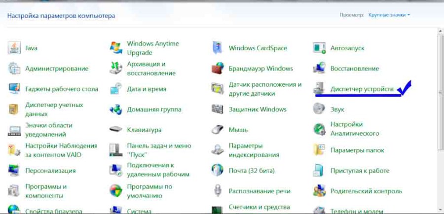 - Выбираем «Крупные значки» вверху окна, затем «Звук»;