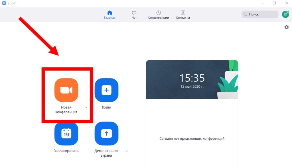 - Кликните на кнопку Новая конференция. На этом этапе сразу определитесь, будете вы входить сразу с видео или без него.