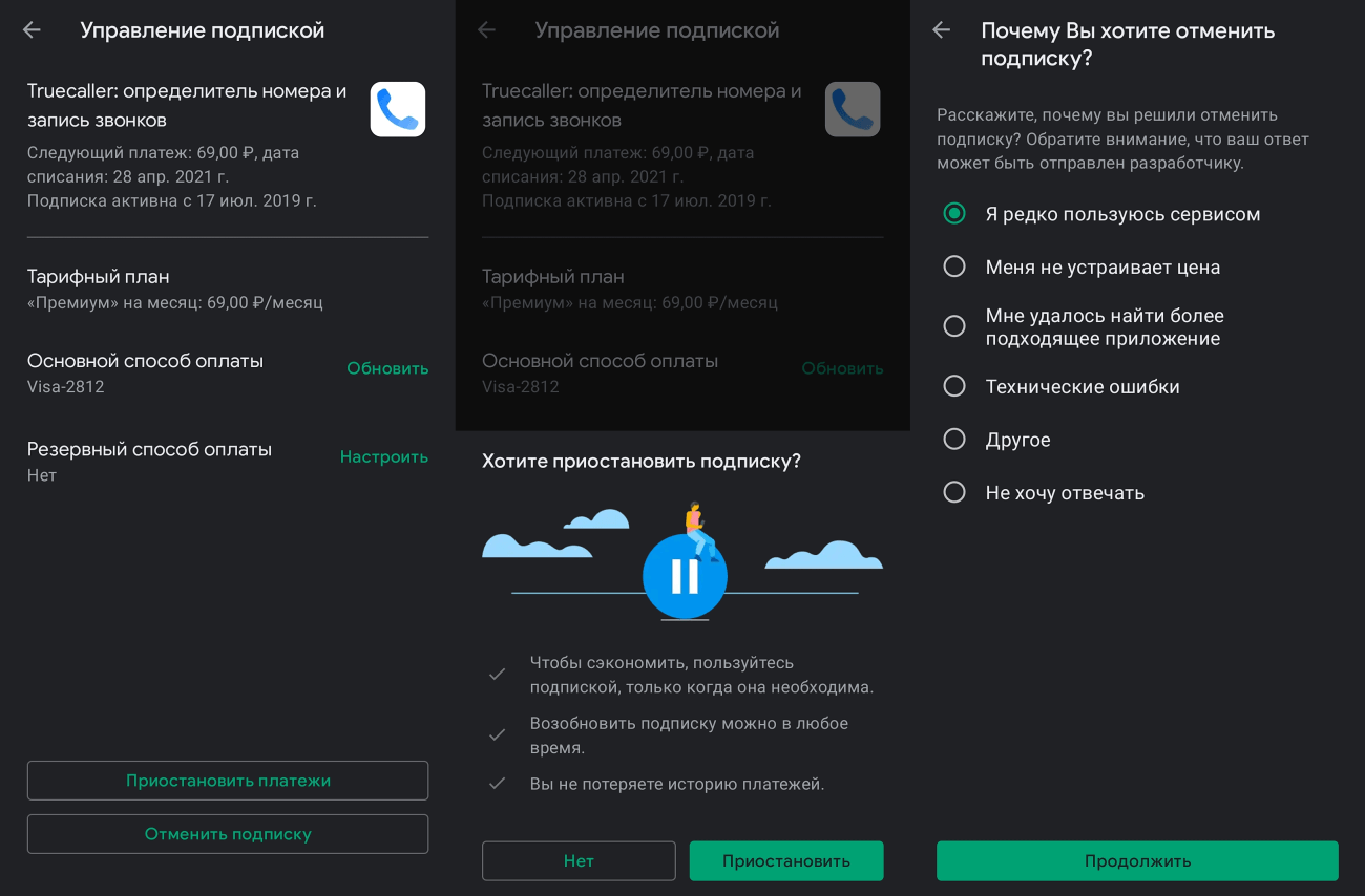 Если выбрать вариант «Приостановить», то можно будет выбрать нужный срок: от 1 до 3 месяцев, после окончании которого — деньги снова начнут списываться.