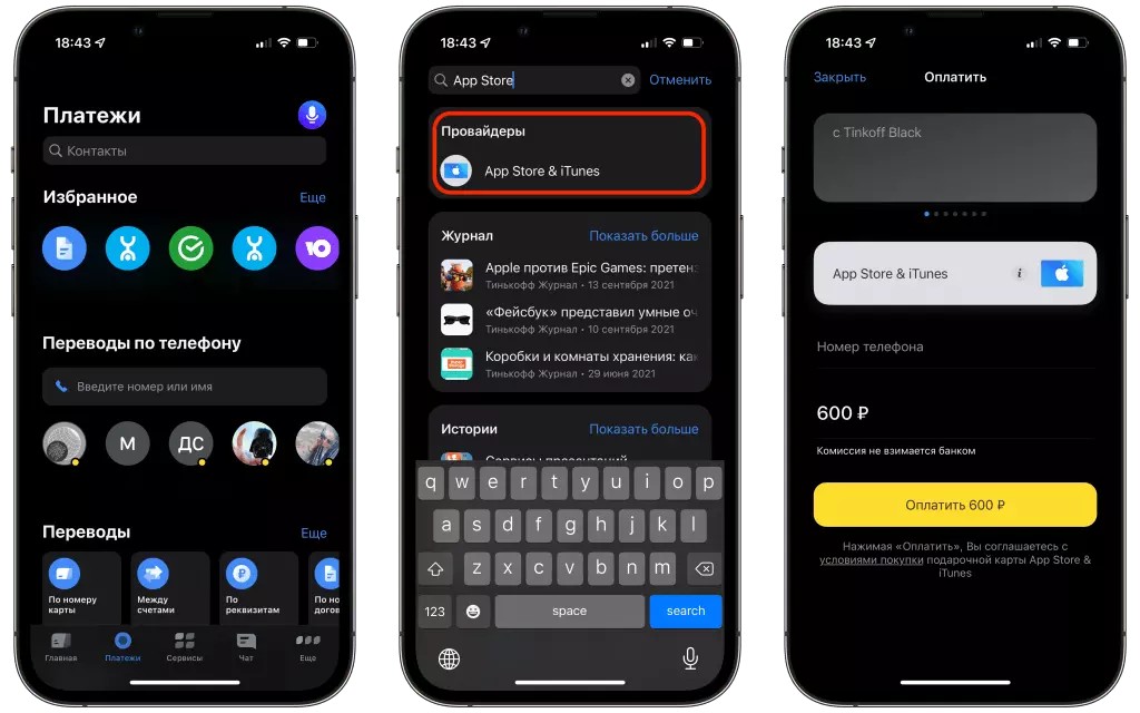 В «Тинькофф» и других банковских приложениях существует раздел «Платежи», где нужно вбить в поле поиска «App Store» и выбирать провайдера «App Store & iTunes». Затем необходимо прописать в поле свой номер телефона, на который придет код активации, и указать любую сумму пополнения.