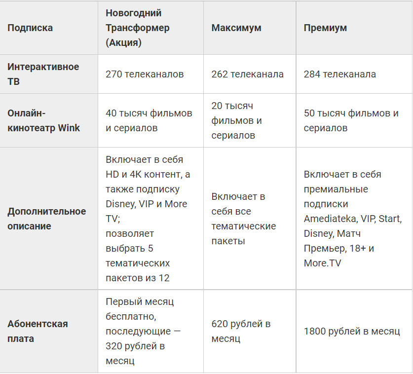 Для пользователей услуги “Интерактивного ТВ” тарифы на новенький Винк удивления не вызовут: почти аналогичные пакеты. Оплата за подписку вносится ежемесячно. Трафик на Интерактивное ТВ из лимита домашнего Интернета не расходуется.