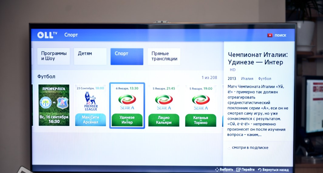 Еще одна фишка платформы — двухуровневый подход. Щелкнув по одной из карточек, открывается дополнительное меню, где показываются прямые ссылки на фильмы, сериалы и прочий контент из этого приложения. Из прочих функций: возможность записи телеэфиров, поддержка Apple TV и AirPlay. Основной минус — скудный набор приложений.