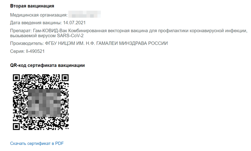 - Ждем, пока необходимая информация загрузится и отобразится на экране. Вы увидите, когда была введена последняя часть вакцины, сможете ознакомиться с данными о выбранном препарате и квадратным QR-кодом. Чтобы сохранить электронный документ, нажимаем на кнопку «Скачать сертификат в PDF».